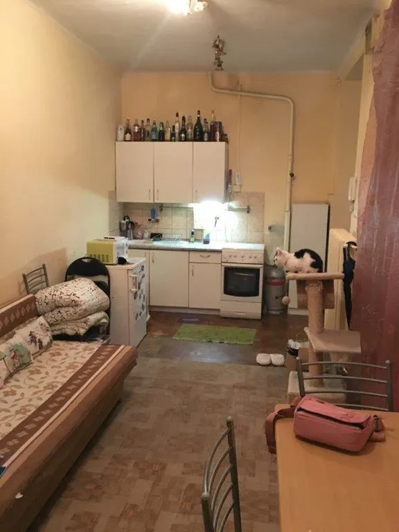 A pici ingatlan két helyiségből áll, ajtajából egyenesen a szobába, illetve annak előterébe lépünk. Itt egy beépített szekrény után rögtön a konyhai rész következik, amely már a szobához tartozik, amerikai konyhának nem lehet nevezni. Tulajdonképpen csak a mosogató, egy konyhai szekrény és a sütő van rátolva a kis területen csempével burkolt falra.