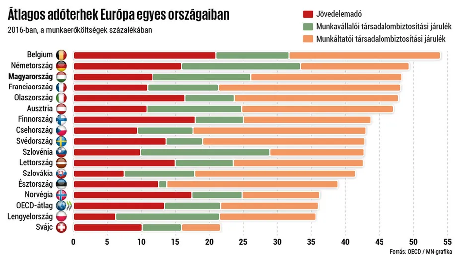 Az OECD felméréséből kiderült: az elvonás Belgiumban a legjelentősebb 54 százalékkal, míg a második Németország (49,4 százalék), majd mindjárt Magyarország jön 48,2 százalékkal. Még Franciaország (48,1 százalék), Olaszország (47,8 százalék) és Ausztria (47,1) is utánunk következik.