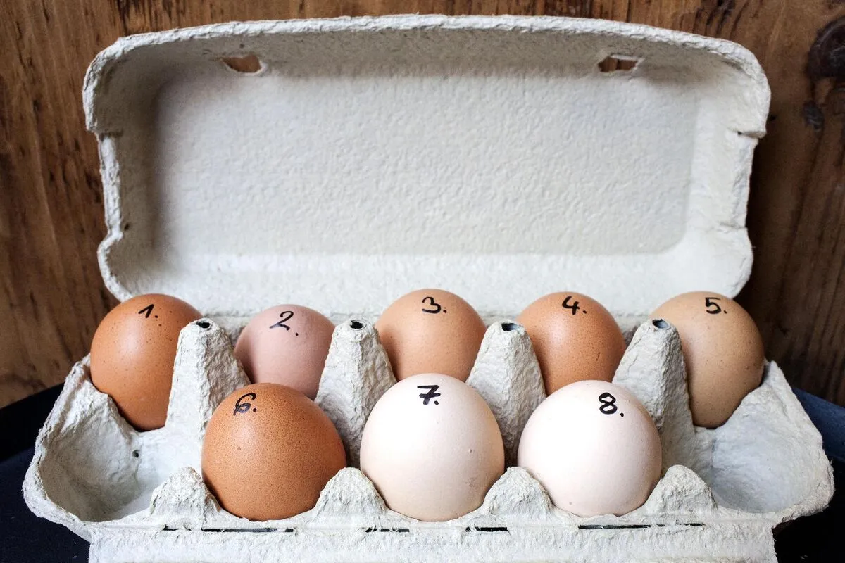 Kizárólag mélyalmos tojásokat vetettünk alá a próbának, tehát olyanokat, amelyek feltételezhetően jobb minőségűek. Ezekből aránylag kicsi a választék. Az Auchanban és a CBA-ban is kétféle volt, a Tescóból a saját márkás Finest – azaz kiemelkedő minőségű – dobozt vettük le a polcról, és választottunk melléjük két olyan – „kéz alatt” beszerezhető – tojást is, amelyeket ismerős ismerősének tyúkjai tojtak, valamint még egy ismert, szabad tartású gazdaságból származót.
