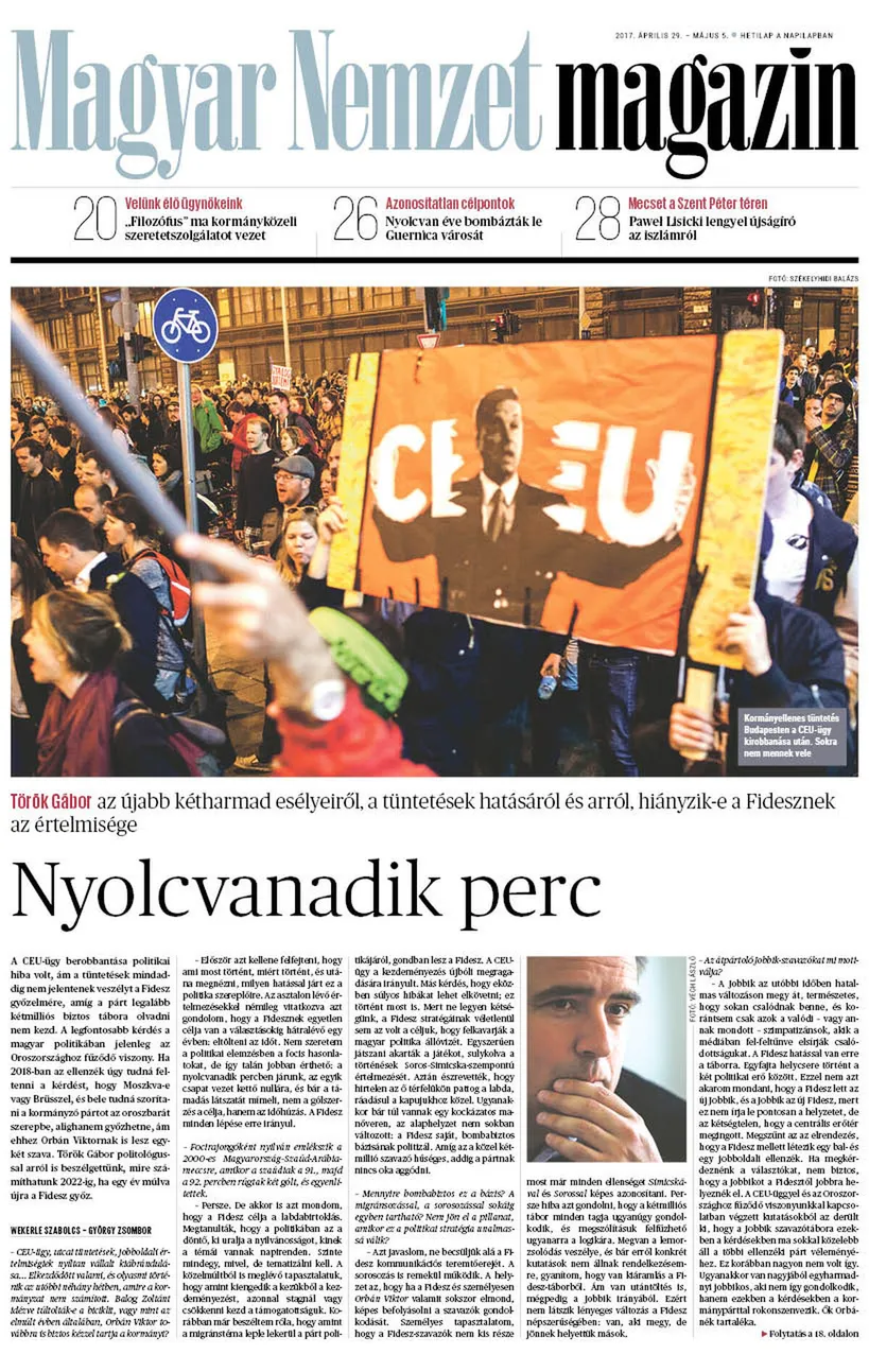 „Korábban már beszéltem róla, hogy amint a migránstéma leple lekerül a párt politikájáról, gondban lesz a Fidesz. A CEU-ügy a kezdeményezés újbóli megragadására irányult. Más kérdés, hogy eközben súlyos hibákat lehet elkövetni; ez történt most is. Mert ne legyen kétségünk, a Fidesz stratégáinak véletlenül sem az volt a céljuk, hogy felkavarják a magyar politika állóvizét. Egyszerűen játszani akarták a játékot, sulykolva a történések Soros–Simicska-szempontú értelmezését. Aztán észrevették, hogy hirtelen az ő térfelükön pattog a labda, ráadásul a kapujukhoz közel. Ugyanakkor bár túl vannak egy kockázatos manőveren, az alaphelyzet nem sokban változott: a Fidesz saját, bombabiztos bázisának politizál. Amíg az a közel kétmillió szavazó hűséges, addig a pártnak nincs oka aggódni.” (Török Gábor)