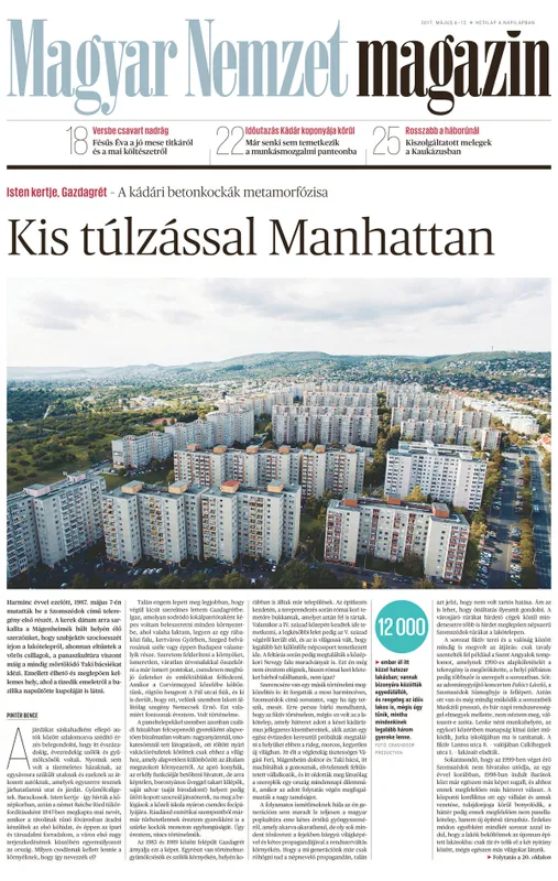 Harminc évvel ezelőtt, 1987. május 7-én mutatták be a Szomszédok című teleregény első részét. A kerek dátum arra sarkallta a Mágenheimék hűlt helyén élő szerzőnket, hogy szubjektív szocioesszét írjon a lakótelepről, ahonnan eltűntek a vörös csillagok, a panaszkultúra viszont máig a mindig zsörtölődő Taki bácsiékat idézi. Emellett élhető és meglepően kellemes hely, ahol a tizedik emeletről a bazilika napsütötte kupoláját is látni.