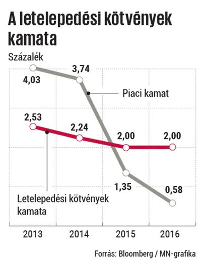De most nézzük meg a konkrét számadatokat! A letelepedésikötvény-program pontosan négy esztendeje, 2013 júniusában indult el. Abban az évben az állampapírok átlagos piaci hozama 4,03 százalék volt, míg a letelepedési papírok után 2,53 százalékos kamatot fizetett az állam. Ebben az évben tehát – költségvetési szempontból – jól járt hazánk a programmal, hiszen az államkassza 2,1 milliárd forintot spórolt. Hasonló volt a helyzet 2014-ben is, miután a piaci kamat 3,74, míg a letelepedési kötvények kamata 2,24 százalék volt. A büdzsé 8,7 milliárd forintot nyert. Fordulópontot a 2015. esztendő hozott, hiszen az európai állampapírok hozamai drasztikusan csökkentek, ennek megfelelően a magyar piaci kamatok is visszaestek, az ötéves hazai állampapírok esetében ez 1,35 százalékra zuhant.