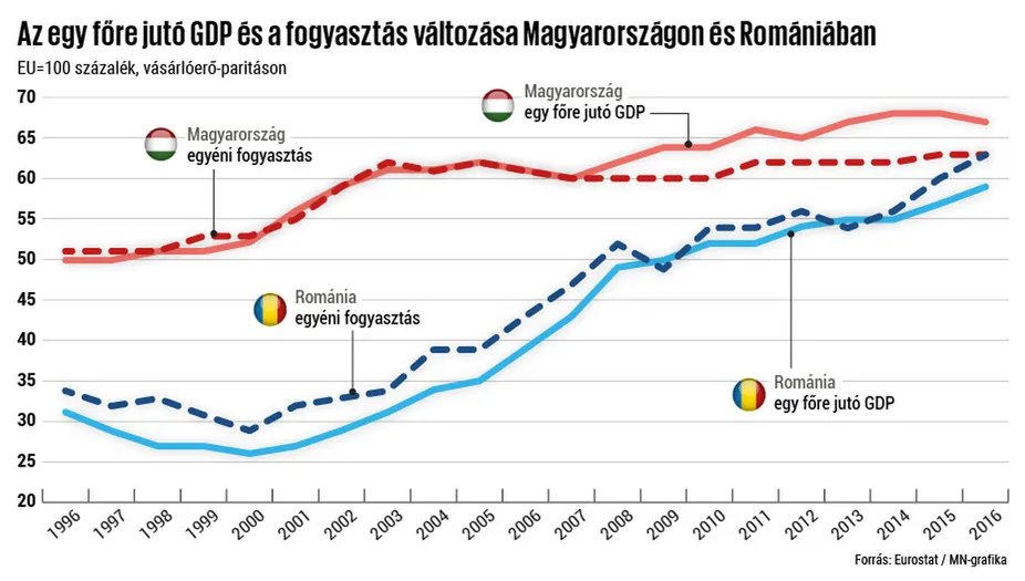 Románia most e mutató alapján érte utol Magyarországot, ami különösen annak fényében meglepő, hogy a vásárlóerő-paritáson mért egy főre jutó GDP még mindig magasabb hazánkban, mint keleti szomszédunknál. De másik érdekességet is találunk: miközben az egy főre jutó GDP hazánkban 2012 óta folyamatosan nő, az egyéni fogyasztásunk szinte stagnált – nem úgy Romániában, ahol a GDP növekedésével párhuzamosan 2013-tól rohamosan megugrott az egyéni fogyasztás, így már a múlt évben lehagytak minket.