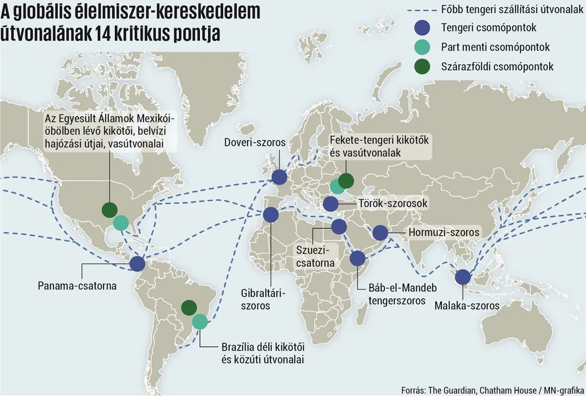 A Panama-csatornát az utóbbi időben a száraz idő miatt kell rendszeresen „bezárni”, a Szuezi-csatornát pedig az egyre gyakoribb homokviharok mellett az is fenyegeti, hogy a Chatham House szerint idővel terrortámadás célpontjává válhat. Utóbbi alapvető jelentőségű az erősen élelmiszerimport-függő közel-keleti és afrikai államok számára. A fekete-tengeri kikötőkbe érkező orosz gabona szárazföldi útvonalát szintén fenyegethetik időjárási zavarok, áradások, ráadásul a Krím orosz annektálása óta a politikai stabilitás is eltűnt a térségből.