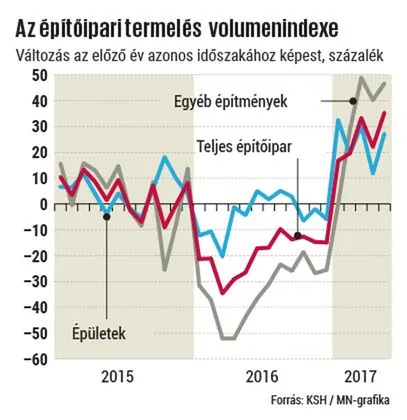 Hiába nőtt tavasz végén óriási mértékben az építőipar teljesítménye, még mindig nem érte el a korábbi évek szintjét. Mégis hatalmas különbség van az előző évek ingatlanépítési láza és a mostani között: olyan sokan vándoroltak ki a közelmúltban, hogy nagyon kevés a szakember, ami óriási csúszásokat okoz az építőiparban, miközben jelentősen nőttek a költségek. Így bár első látásra jól hangzik, hogy a Központi Statisztikai Hivatal (KSH) adatai szerint májusban az építőipari termelés volumene 35,4 százalékkal haladta meg az egy évvel korábbi szintet, ezzel az eredménnyel is csak a 2014. áprilisi teljesítményét hozta a szektor.