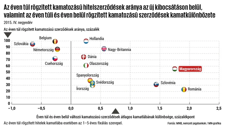 Egyébként a magyar lakáshitelkamatok átlagát az 1–5 évig rögzített kamatozású hitelek nyomják fel, az egy éven belül változó kamatozású hitelek már megközelítik a régiós szintet, viszont a magyar piacon annak ellenére magas a fix hitelek aránya, hogy azok ára sokkal magasabb.