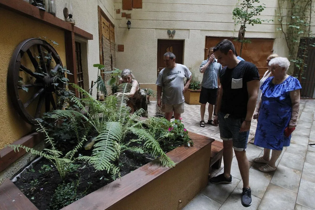 A tizenkét lakásos társasház udvara felé közelítünk, amelyet a lakók saját kezűleg újítottak fel. Olyan, mintha teljesen más kerületbe vagy akár másik országba csöppentünk volna. Burjánzanak a növények, antik díszóra lóg a fából készült ülőalkalmatosságon, kis faszékek, díszburkolat és egy nagy lovaskocsi-kerék színesíti az udvart, utóbbi is telis-tele virágokkal. – Ez még a régi tulajdonosoké volt. Lovas kocsin hozták be a szenet a villába. Megtaláltuk, felújítottuk, és felhasználtuk dísznek – meséli Ádám, miközben a ház többi lakója is összeverődik az udvaron.
