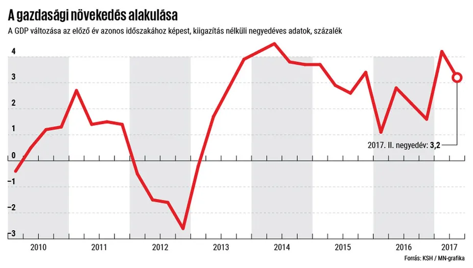 A vártnál is lassabban bővült a gazdaság, miután a Központi Statisztikai Hivatal (KSH) adatai szerint a második negyedévben 3,2 százalékot nőtt a bruttó hazai termék (GDP). Az első negyedévben még 4,1 százalékos volt a növekedés üteme éves alapon. Az elemzők is lassulást vártak, miután az ipari termeléssel és az építőipar teljesítményével kapcsolatban vegyes adatok láttak napvilágot az előző hónapokban.