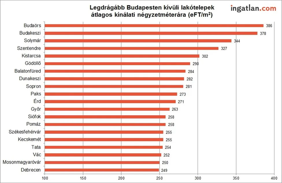 Az árak is a főváros közelében lévő településeken a legmagasabbak. Budaörs a legdrágább, az ottani lakótelepen 386 ezer forintért hirdetik a lakások négyzetméterét, majd Budakeszi és Solymár következik 378 ezer, illetve 344 ezer forintos átlagárral.