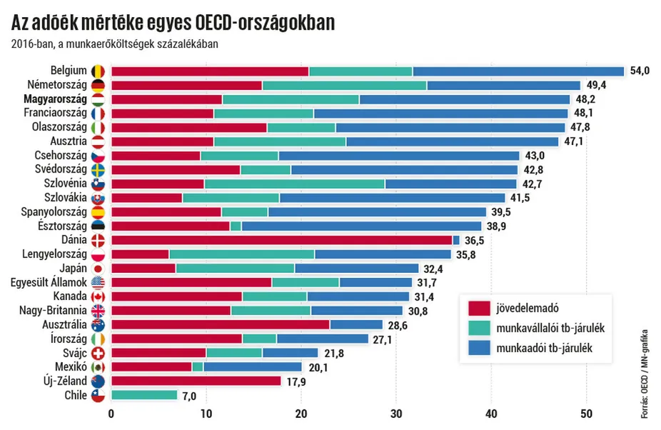 Továbbra is dobogós Magyarország az egy munkavállalóra jutó adók és járulékok mértékét illetően a Gazdasági Együttműködési és Fejlesztési Szervezet (OECD) országainak mezőnyében. A szervezet nemrég kiadott, 2016-os számokra támaszkodó összesítése szerint hazánkban – családi kedvezmények nélkül – a bruttó fizetések 48,2 százaléka landol az államnál. Ennél magasabb adóék (adók és járulékok a teljes bérköltség százalékában) csak Belgiumban (54 százalék) és Németországban (49,4 százalék) van. A régiós országok közül Csehország áll hozzánk a legközelebb – a teljes listán a nyolcadik helyen – átlagosan 43 százalékos adó- és járulékfizetési szinttel, míg Szlovákia a tizenkettedik, 41,5 százalékkal, Lengyelország pedig a huszonharmadik, 35,8 százalékos adóékkel. A legalacsonyabb, a bruttó jövedelem 21,8 százalékát kitevő kötelezettséggel Svájcban kell számolni Európában, míg az uniós tagországok között Írországban a legkisebb, 27,1 százalékos az adóék.