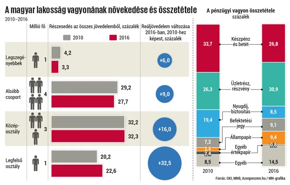 Idehaza ugyanakkor nem ez a helyzet. A GKI Gazdaságkutató – az Eurostat adatait feldolgozva – arra jutott, hogy a 2010–2016 közötti időszakban egyre jobban nyílt az olló a leggazdagabbak és a legszegényebbek vagyoni helyzete között. A legszegényebbek egymilliós tábora tavaly csak a vagyonok 3,3 százalékát birtokolta, szemben a hat évvel azelőtti 4,2-del. A náluk valamivel jobban élő négymillió magyar jövedelmi részesedése 29,2-ről 27,7 százalékra esett vissza. A középosztály hárommilliós táborának helyzete alig változott, hiszen 32,2 százalékos részesedése alig egytized százalékponttal lett nagyobb. Jól járt viszont a leggazdagabb egymillió magyar, hiszen amúgy is jelentős vagyonukat tovább növelték, s részesedésük az összes jövedelemből a 2010-es 20,2 százalékhoz képest 1,6 százalékponttal emelkedett. A legszegényebbek helyzete az elmúlt tíz év átmeneti javulását követően romlani kezdett. A GKI adatai szerint amíg a leggazdagabb és a legszegényebb egy-egy millió magyar egy főre jutó jövedelme között a különbség 2006-ban 7,5-szeres volt, ez az arány 2010-re 4,3-szeresre csökkent, utána azonban emelkedni kezdett, s tavalyra 5,4-szeresre nőtt.