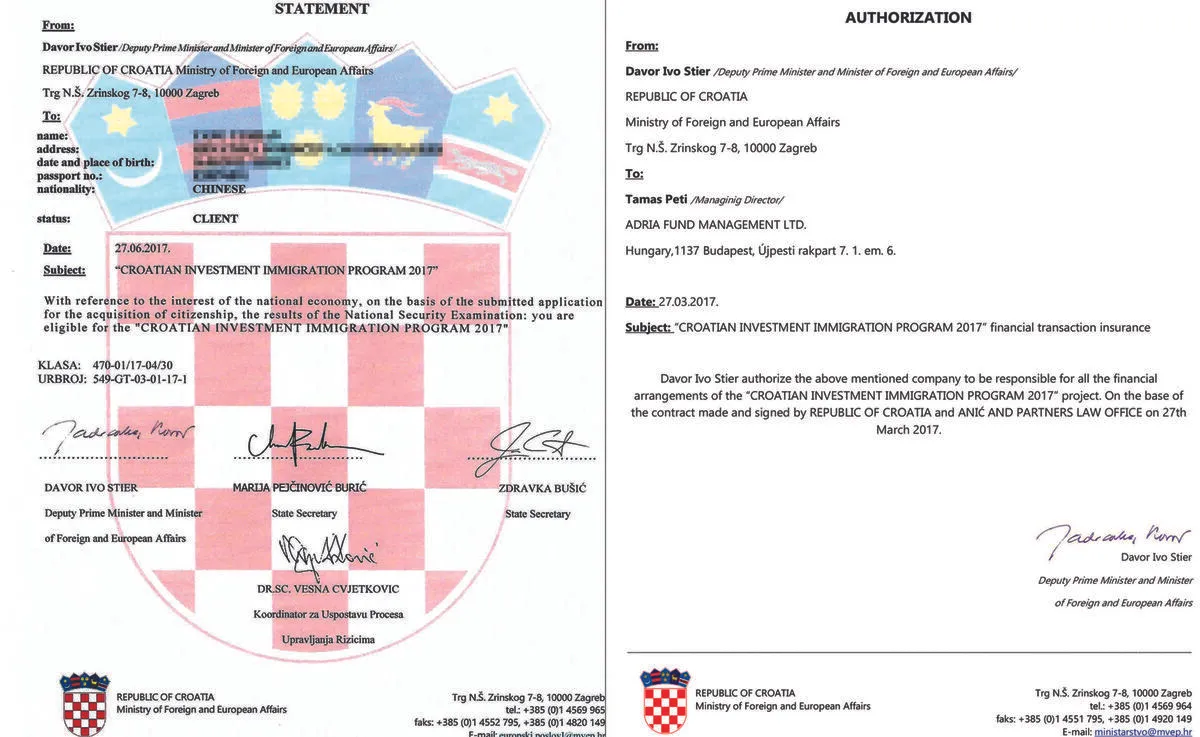A lapunknak nyilatkozó üzletember úgy döntött, hogy belevág a programba, de ragaszkodott ahhoz, hogy a külföldiek pénze egy ügyvédnél kerüljön letétbe, aki csak akkor utalhatja tovább az összeget, ha megkapta az ügyfél horvát útlevelét. Peti Tamás a Pintér Ákos Ügyvédi Irodát ajánlotta, amely egyébként ugyanott van bejelentve, ahol az Adria Fund, vagyis Budapesten, az Újpesti rakpart 7. I. 6. számú lakásában. Nem sokkal később, június 27-én, szintén Davor Ivo Stier szignójával újabb dokumentum érkezett, amely hivatalosan is megerősítette, hogy a kínai ügyfelek – akik egyesével, névre szólóan kapták meg a papírt – alkalmasak a horvát programban való részvételre.