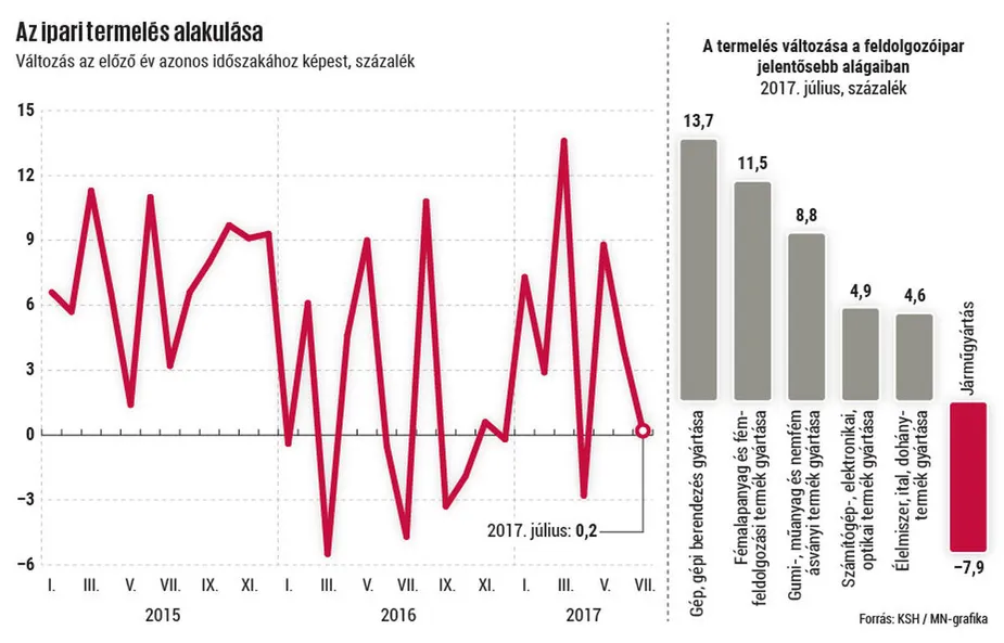 A magyar gazdaság makroszámai ma már jók, az összkép ugyanakkor sokkal árnyaltabb ennél – tartja számos közgazdász. Ők elsősorban arra hívják fel a figyelmet, hogy túl nagy szerep jut az összteljesítményt tekintve néhány ágazatra, ezért bármiféle ezeket érintő negatív hatás azonnal meglátszik az egész magyar gazdaság mutatóin. Hogy ez mennyire így van, azt jól érzékeltetik a Központi Statisztikai Hivatal (KSH) friss ipari termelési adatai. A KSH második gyorsbecslése szerint ugyanis idén júliusban a hazai ipar teljesítménye 4,2 százalékkal múlta alul a májusit, és ez még akkor is jelentős visszaesés, ha tavaly júliushoz képest még mindig 0,2 százalékkal emelkedett a termelés. A zuhanás okát egyértelműen abban látják a szakértők, hogy kisebb sebességi fokozatra kapcsoltak a magyarországi autógyárak, és ez az egész ipar teljesítményére rányomta a bélyegét. A júliusi magyar visszaesés a második legnagyobb mértékű volt az Európai Unióban. A szintén erős autóiparral rendelkező Csehország produkálta a legnagyobb, tízszázalékos mínuszt. Az autógyártásban ugyancsak erős Szlovákia 3,3 százalékos visszaesést produkált júliusban a májusi mutatóhoz képest.