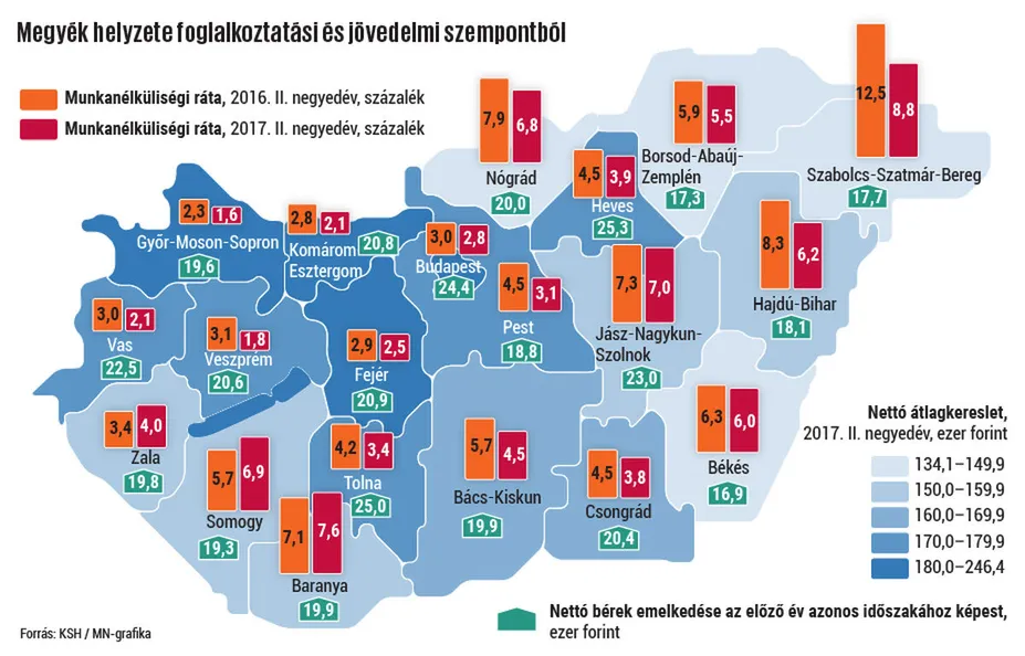 Az összefoglaló szerint a nyugat-magyarországi megyékben, valamint Budapesten voltak a legmagasabbak az átlagos havi nettó keresetek 2017 első fél évében; a fővárosban ennek szintje meghaladta a 246 ezer forintot, míg Győr-Moson-Sopron megyében 200 ezer, Komárom-Esztergomban és Fejérben pedig 189, illetve 184 ezer forint körül alakultak az átlagos fizetések. Az északkeleti megyékben és Békésben ugyanakkor még a 150 ezer forintot sem érték el a bérek. Szabolcs-Szatmár-Bereg megyében a legrosszabb a helyzet, ahol mindössze 134 ezer forintból kénytelen kijönni havonta egy átlagos munkavállaló, ez 112 ezerrel kevesebb, mint amennyit Budapesten lehet megkeresni. A különbség ráadásul növekszik, hiszen 2016 első felében a fővárosi 222 ezres átlagos kereset „csak” 106 ezerrel volt több, mint a legkeletibb megyében. Vas, Veszprém, Pest és Heves megyében 170 és 178 ezer forint között vitt haza egy átlagos dolgozó, míg a déli megyékben a bevételek nem érték el a 160 ezer forintot. Az egy évvel korábbi adatokhoz képest 10–13 ezer forinttal nőttek a havi átlagos keresetek.