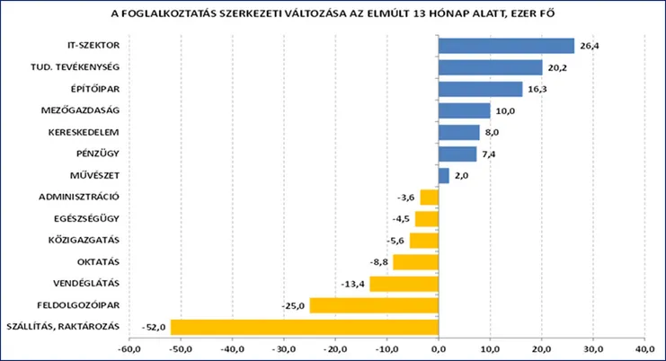 A magyar munkaerőpiac valójában nem válságba került, hanem átalakul. 26 ezerrel többen dolgoznak az IT-szektorban, 20 ezerrel többen a tudományos tevékenység területén, 16 ezerrel többen az építőiparban és kevesebben a turizmusban, vendéglátásban és a szállítás/raktározás területén.