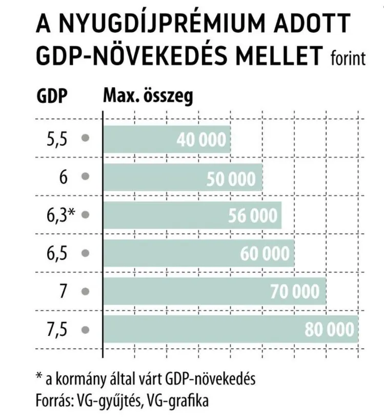 A kormány is nagyjából ezt az eredményt prognosztizálja. Orbán Viktor miniszterelnök a vasárnapi rádióinterjújában arról beszélt, hogy a gazdaság száguldásának köszönhetően lesz lehetőség nyugdíjprémiumot fizetni. Jelenleg 50-56 ezer forintos egyszeri kifizetést lát valószínűnek, de hozzátette: az összeg akár ennél jóval magasabb is lehet.