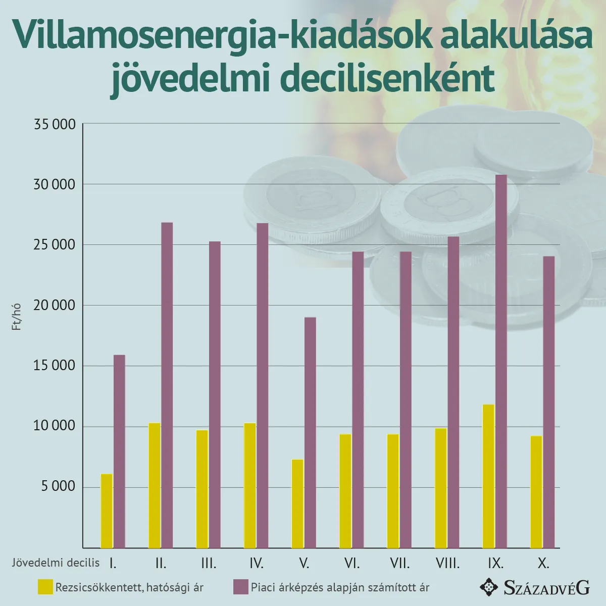 Az ábra alapján látható, hogy téves az a kritika, ami szerint a rezsicsökkentés a legtehetősebbeket védi, míg a legszegényebbeken nem segít. Az energiadíjak növekedése valamennyi jövedelmi tizedben jelentős többletterhet jelentene. És bár a növekmény mindkét energiahordozó esetében a kilencedik decilisben lenne a legnagyobb, a kiadási arányok alapján a legnehezebb helyzetbe a két legalsó decilis tagjait sodorná, ahol a háztartások jelenleg összes kiadásuk 12 százalékát költik a két termékre, de az áremelkedés hatására az arány 35 százalékra nőne. Annak, hogy a piaci árak bevezetése a legtehetősebbeket kevésbé sújtaná (a villamos energia esetében a növekmény a legnagyobb jövedelmű decilisben a harmadik legalacsonyabb lenne) az elsődleges oka, hogy a kategória tagjai energiahatékony berendezésekkel rendelkeznek és jellemzően kisebb létszámban laknak egy háztartásban, így energiafogyasztásuk is alacsonyabb más deciliseknél.