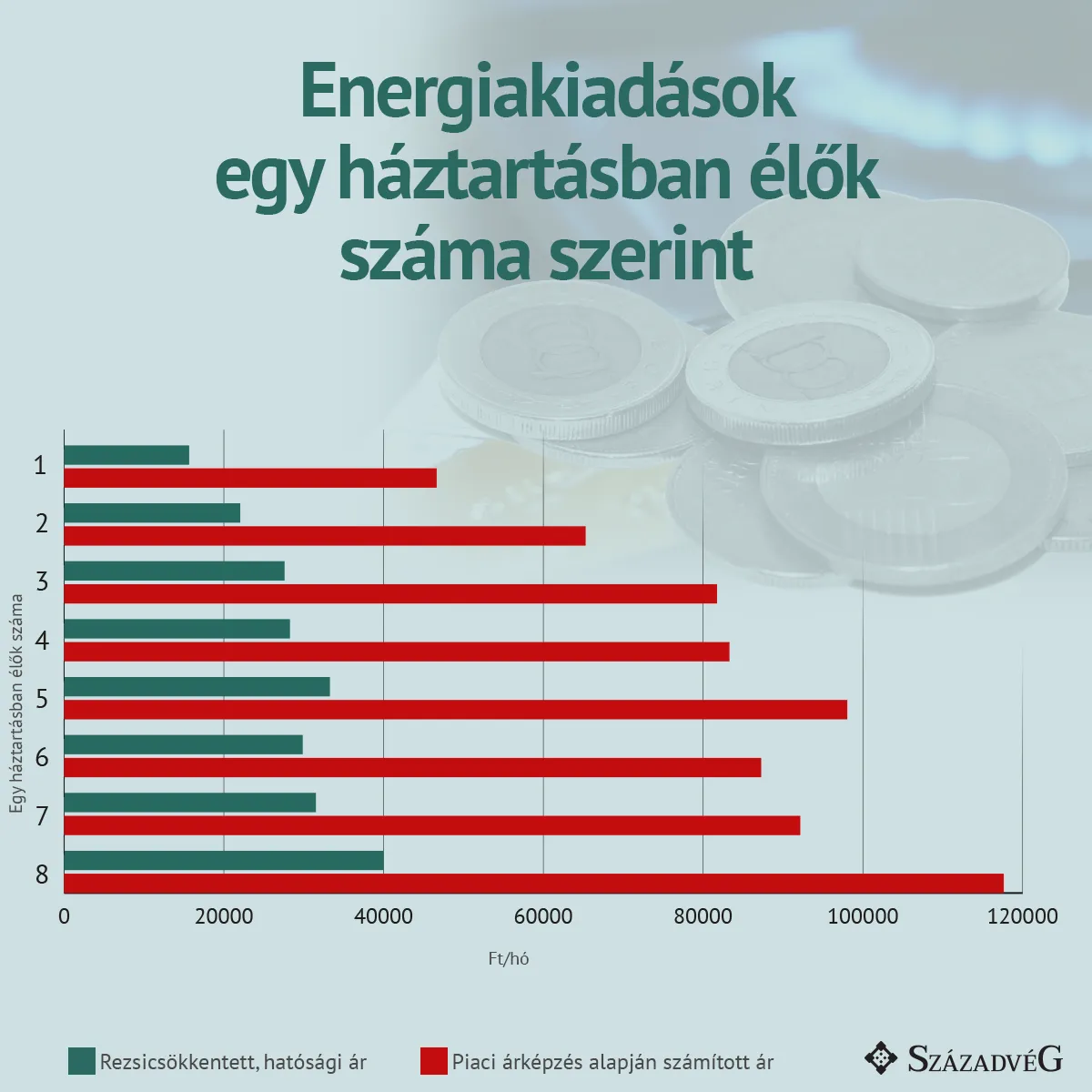 A háztartások energiafogyasztását nagymértékben befolyásolja az együttélők száma, így a piaci árak bevezetésével járó áremelkedés leginkább a családokat sújtaná. Míg azokban a háztartásokban, ahol egyetlen fő lakik, a két energiahordozóra számított összesített kiadásnövekmény 31 ezer forint lett volna, azok a családok, ahol nyolc fő él együtt, több mint 77 ezer forinttal fizethettek volna többet októberben. Az áremelkedéssel utóbbi kategória energiaköltségeinek aránya az összesített kiadásaikból a jelenlegi 13 százalékról 37 százalékra növekedne.