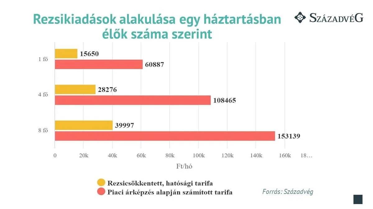 Míg egy egyedül élő esetében a jelenlegi, 16 ezer forintos rezsiszámla 45 ezer forinttal, összesen 61 ezer forintra emelkedett volna, a növekmény mértéke egy négyfős család esetében meghaladta volna a 80 ezer forintot, egy nyolcfős családnál pedig a 110 ezer forintot. Utóbbi esetében ez azt jelentené, hogy a rezsiköltségek aránya a teljes kiadásban 13 százalékról 50 százalékra növekedett volna, azaz egy többgenerációs nagycsalád kiadásainak felét kénytelen lett volna az energiaszámlái befizetésére fordítani.