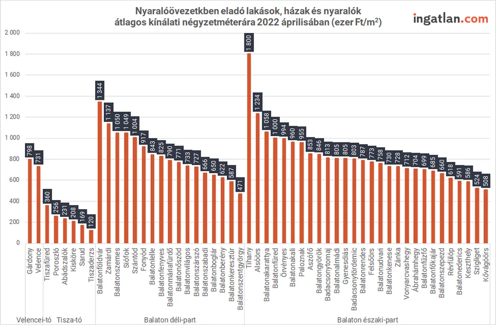 A keresletcsökkenés azonban egyelőre nem látszik a kínálati négyzetméter árakon, azok ugyanis emelkedést mutatnak. Siófokon például egy év alatt 47 százalékkal 1 millió forint fölé kerültek az átlagos négyzetméterárak. A déli parton Szántód, Zamárdi, Balatonföldvár és Balatonszemes azok a települések, ahol az átlagos négyzetméterárak szintén meghaladják a milliós lélektani határt. A déli part legolcsóbb települése Balatonkeresztúr 587 ezer forintos négyzetméterenkénti átlaggal. Az északi part milliós toplistájába tartozik Alsóörs, Balatonakarattya, Balatonfüred az átlagos négyzetméterárak alapján, illetve az egész Balaton legdrágább települése Tihany. Itt négyzetméterenként átlagosan 1,8 millió forintot kell fizetni egy eladó lakásért, házért vagy nyaralóért. A legolcsóbb északi parti település Szigliget 524 ezer forintos átlagárral.