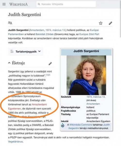 A fenti képeknél jól látszik, hogy Sargentini esetében csak bölcsész diploma szerepel az EP honalapján, a lenti képeknél viszont már csak mesterfokozatról írnak. Érdekesség az is, hogy az adatok frissítése azt követően történt meg, hogy a magyar sajtó Sargentini végzettségével kapcsolatos kérdéseket kezdett feszegetni.