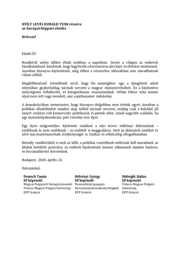 "Megdöbbenéssel értesültünk arról, hogy Ön nemrégiben egy, a Spiegelnek adott interjúban gyakorlatilag nácinak nevezte a magyar miniszterelnököt. Ezennel mélységes felháborodásunkat fejezzük ki, és kategorikusan visszautasítjuk az Ön nyilatkozatát.
