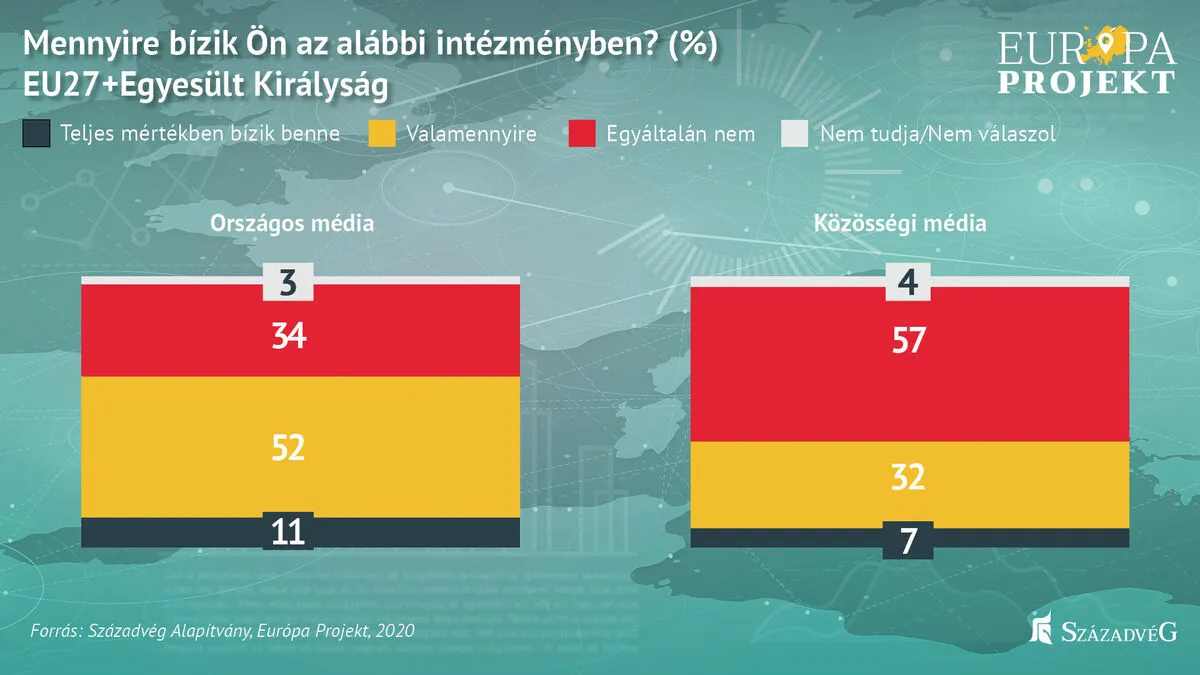 Az összes EU-tagállamban és az Egyesült Királyságban az emberek 57 százaléka egyáltalán nem bízik a közösségi médiában (a 2019-es 54 százalékhoz képest ez enyhe emelkedés). Hogy ez a szám mennyire magas, az az országos médiába vetett bizalommal összevetve válik világossá: bár az emberek általában a médiával kapcsolatban gyanakvóak, mégis az elutasítottság aránya pusztán 34 százalék az országos média esetében. (Az EU-tagállamokban és az Egyesült Királyságban a megkérdezettek többsége, 52 százalékuk bízik valamennyire az országos médiában, míg a közösségi médiában csak 32 százalékuk.) Magyarországon a megkérdezettek 48 százaléka egyáltalán nem bízik a közösségi médiában.