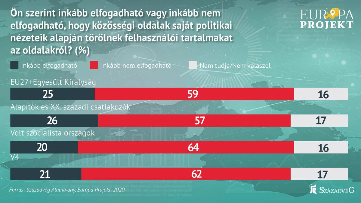 Ami a cenzúrát illeti, 25 százalék azoknak az aránya az összes tagállamban és az Egyesült Királyságban, akik elfogadhatónak tartják, hogy a közösségi médiafelületek politikai alapon töröljenek tartalmakat. A cenzúra elutasítottsága magasabb a volt szocialista országokban (64 százalék) és a V4 országaiban (62 százalék), mint az EU-alapítók és korábban csatlakozók körében (57 százalék).