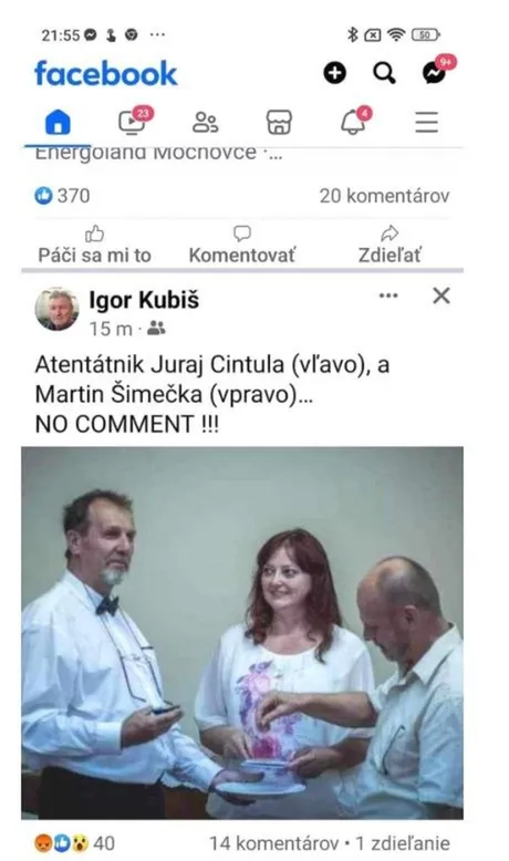 A mellékelt fényképen ugyanis a Robert Ficóra többször is rálövő Juraj Cintula nem mással pózol, mint Martin M. Simeckával, aki a balliberális Progresszív Szlovákia elnökének, Michal Simcekának az apja. Csütörtökön pedig egy 2019-ből származó, terjengős bejegyzés került elő a Cintula által alapított Szivárvány nevű, lévai irodalmi klub weboldaláról, amelyben a merénylő a Progresszív Szlovákia akkori elnök-jelöltje mellett tett hitet. – Zuzana Caputovát támogatom! A nő nem csak arra van, hogy a fiú sötétedés után libabőrös háttal üldögéljen, miközben csuklik a gyönyörűségtől – írta akkor Fico későbbi merénylője.