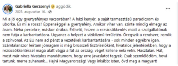 „Számtalanszor leírtam jómagam is még brüsszeli tisztviselőként, hivatalos jelentésekben, hogy a rezsicsökkentéssel maga alatt vágja a fát az ország, véget kellene neki vetni. Hasztalan. Hát, most már nincs hivatalos mandátumom, hogy erre javaslatot tegyek”