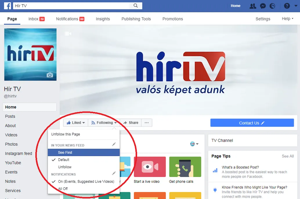 A másik módszer, hogy a Hír TV Facebook-oldalára kattintva kiválasztja a „Követed” (Following) menüpontot, és ott megnyomja a „Megjelenés elsőként” (See First) gombot.