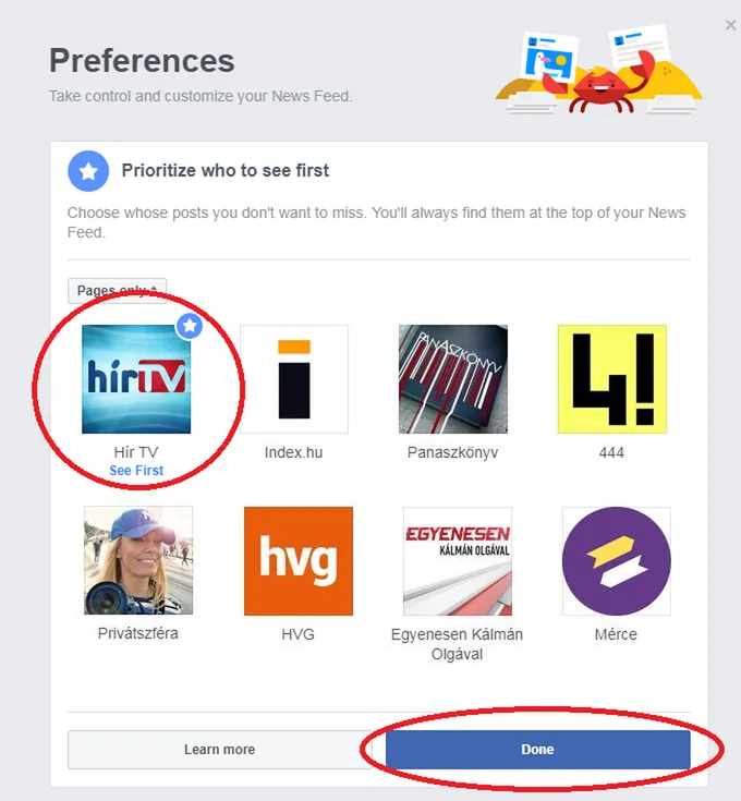 Ezt követően már könnyen kiválaszthatja az elsőként megjelenő oldalai közé a Hír TV-t (miután a listában rákattintott az oldalunkra, egy kék csillag jelenik meg a jobb felső sarokban). Már csak a lista alján lévő „Kész” (Done) feliratú gombra kell rákattintania, és készen is van!