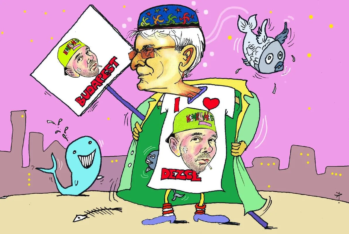 A Keménymag főpolgármester-jelölt jelöltjét támogatandó Pósa Károly elkészítette Dezse Balázs és titkos rajongója, Demszky Gábor karikatúráját.