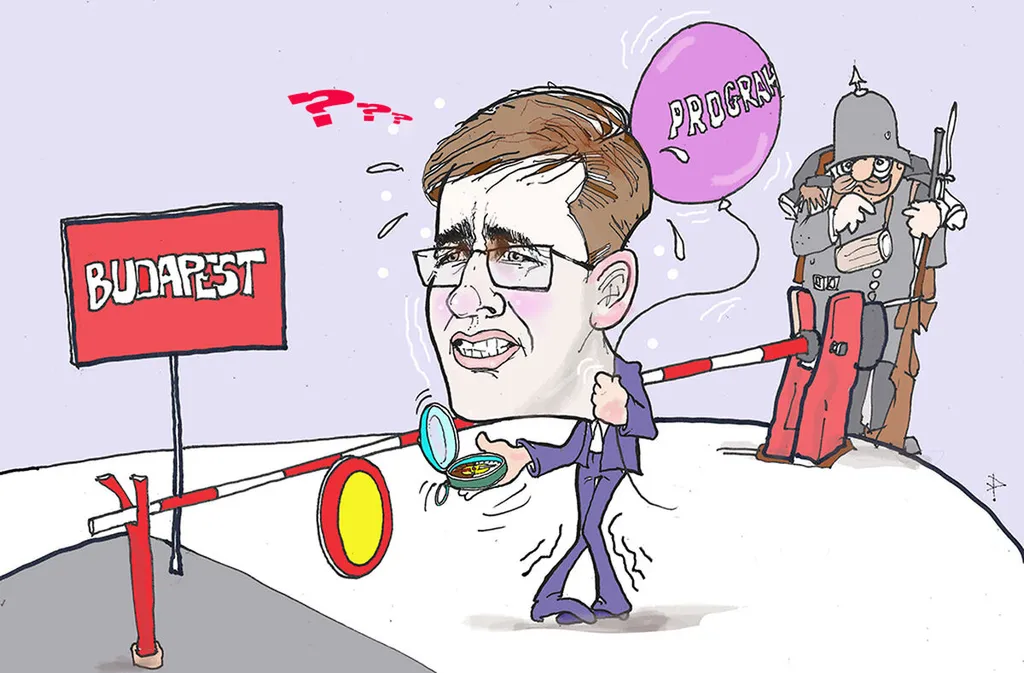 A szokásos karikatúra Pósa Károlytól is az ellenzék főpolgármester-jelöltet ábrázolta, aki a Hajógyári szigeten egy ordenáré ingatlanpanamáról akarta lerántani a leplet, de mint kiderült, egy filmforgatás díszlet-sorompója ismét összezavarta a Budapest helyrajzát erős tétovasággal is alig ismerő Karácsony Gergelyt.