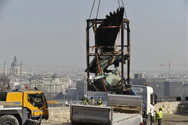 Leemelték helyéről pénteken a budai Várban a turulszobrot. A leromlott állapotú alkotást a szakemberek egy óriásdaruval mozdították el és a Savoyai-teraszon kialakított szabadtéri restaurátorműhelybe szállították - közölte a Várkapitányság Nonprofit Zrt. az MTI-vel.