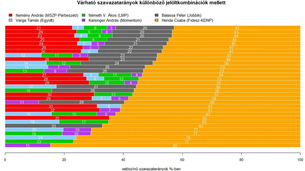 Ha minden ellenzéki elindulna a kerületben, akkor Hende 43 százalékkal vinné a körzetet. Nemény 23, Balassa pedig 20 százalékot kapna. Németh népszerűsége 8 százalékon áll, a Momentum jelöltje 3 százalékot kapna.