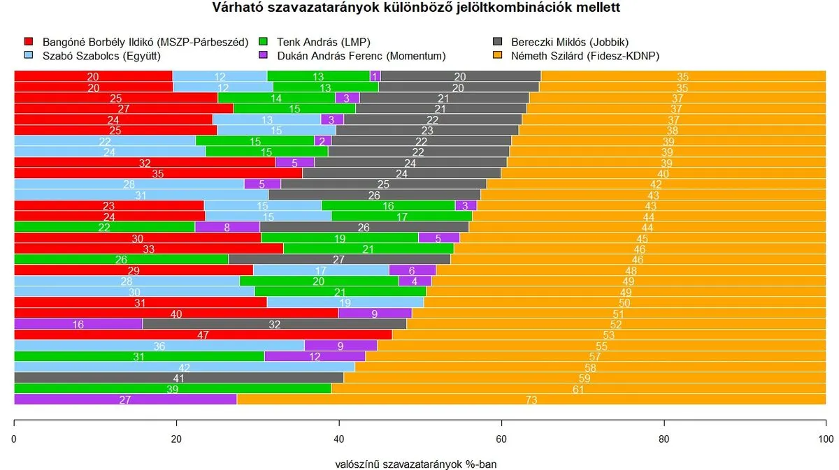 Az elemzések egyik fő tanúsága az, hogy ha nem lesz összefogás Németh Szilárd biztosan behúzza a kerületet. Ha minden így maradna, a kormánypártok jelöltje a szavazatok 35 százalékát szerezné meg, Bangóné és a jobbikos Bereczki Miklós 20-20 százalékot érne el. Az LMP-s Tenk András a voksok 13 százalékát szerezhetné meg, Szabó Szabolcs 12 százalékot érne el, a momentumos Dukán András pedig mindössze 1 százaléknyi szavazatot kapna.